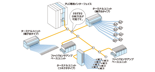 省配線機器ユニラインは、PLCをはじめ、パソコンやSBCなど多くのコントローラーによる制御システムの省配線化を行うユニットです。従来必要であったPLCなどのコントローラから各端末ユニットまでの大量配線を、2芯ケーブル1本(電源は別途必要)で配線することができます。NKEの省配線機器ユニラインは、配線における制約がなく、自由度・耐ノイズ性の高く、メンテナンス性の高い高品質なシステム構築が可能です。